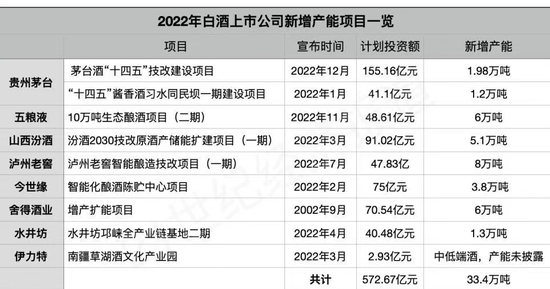 据相关统计,2022年共有8家白酒上市公司公布了9个扩产项目,计划投资总额约572.7亿元,将带来至少33.4万吨新增产能。其中,汾酒2030技改原酒产储能扩建项目(一期)项目总投资约91亿元。建成后预计将新增年产原酒5.1万吨,新增原酒储能13.44万吨。