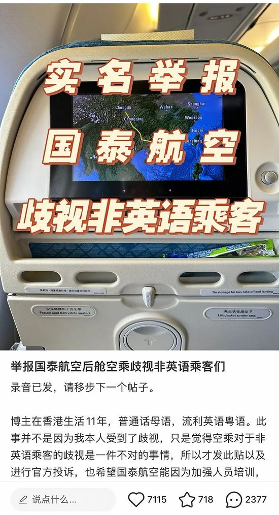 网传国泰航空空乘歧视非英语乘客
