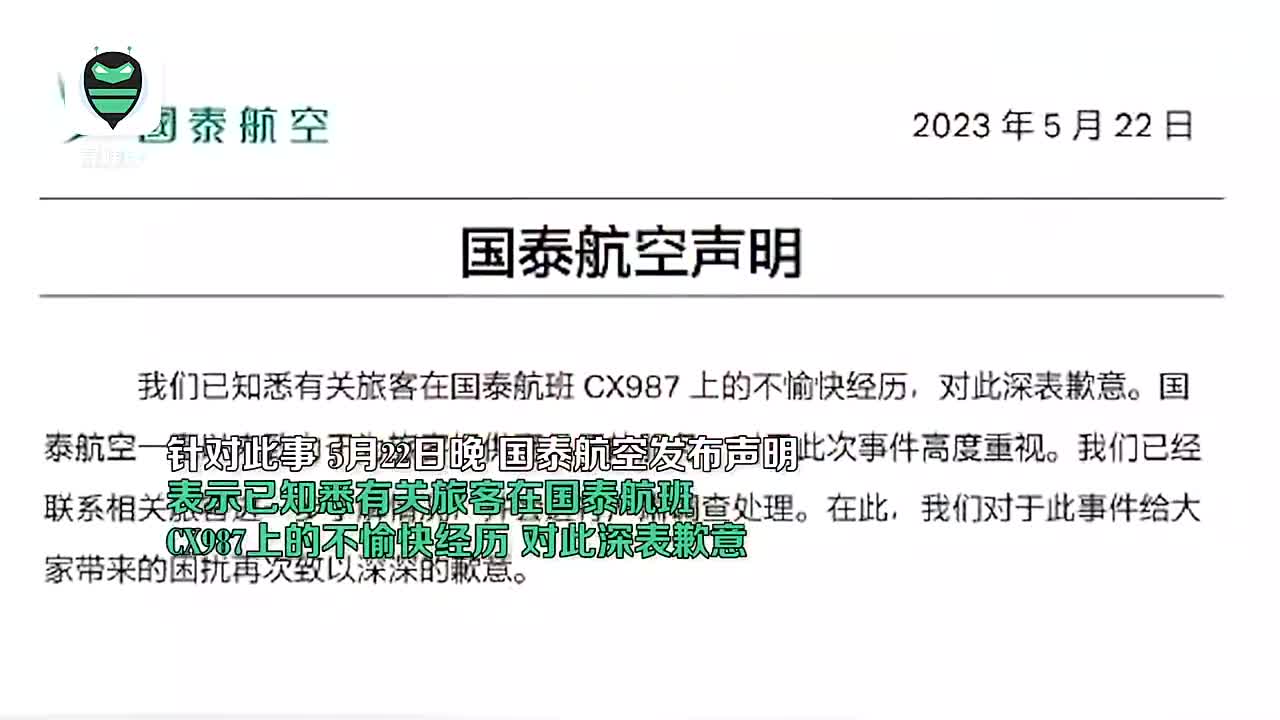 5月22日晚,@国泰航空 发布声明:已知悉有关旅客在国泰航班CX987上的不愉快经历,对此深表歉意。国泰航空一直以来致力于为旅客提供高品质的服务,对于此次事件高度重视。我们已经联系相关旅客进一步了解情况,并会进行严肃调查处理。在此,我们对于此事件给大家带来的困扰再次致以深深的歉意。