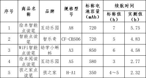 30款样品中,明示续航时间的有11款。其中,实测值低于明示值的样品有5款,实测值高于明示值得有2款,在明示值范围内的样品有4款 。