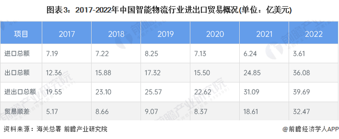 2022年,我国智能物流行业进出口总额达39.69亿美元,实现贸易顺差32.47亿美元。