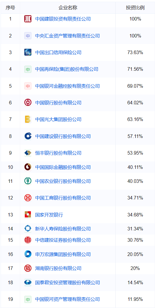 截至2016年底,根据汇金公司官网披露,汇金公司除了拥有四大银行股权以外,还绝对控股光大集团、出口信保、中再集团、中国建投、银河金控、中投证券、中金公司等多家金融业巨头。
