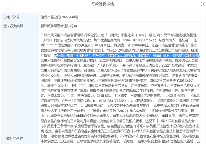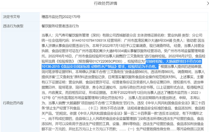 天眼查显示,2022年6月,广东省市场监督管理局曾委托广州市食品检验所对元气寿司餐饮服务管理(深圳)有限公司太阳新天地分店经营的三文鱼刺身进行抽样检验。经抽样检验,大肠菌群项目不符合GB 10136-2015《食品安全国家标准 动物性水产制品》要求,检验结论为不合格,处罚金额为1万元。