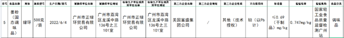 1批次标称生产单位为广州市正绿环贸易有限公司的绿环牌姜粉(固态调味品)铅(以Pb计)检测值为0.747mg/kg,而标准值为≤0.69(干制品)mg/kg。