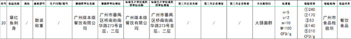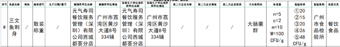 根据公示的信息,在元气寿司餐饮服务管理(深圳)有限公司西城都荟分店抽样的三文鱼刺身大肠菌群不合格。另有1批次在广州雄本雄餐饮有限公司抽样的章红鱼刺身也是大肠菌群不合格。