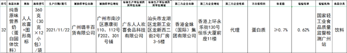 还有1批次标称生产企业为广东人人欢喜食品科技有限公司的纯香原味营养奶(蛋白固体饮料)蛋白质项目不合格,检测值为0.62%。《固体饮料》(GB/T 29602-2013)规定,复合蛋白固体饮料和其他蛋白固体饮料的蛋白质含量不应低于0.7%,样品实际检测含量不符合要求。