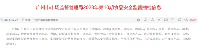 5月22日,广州市市场监督管理局公布了2023年第10期食品安全监督抽检信息,此次共监督抽检2614批次食品,其中,抽检实物质量不合格样品39批次。