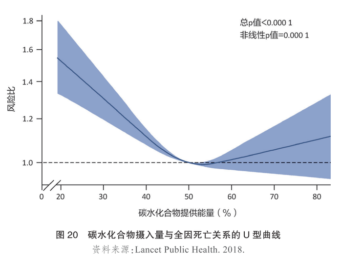 美国人群的队列研究表明,碳水化合物提供的能量百分比与全因死亡率呈 U 型关联,当碳水化合物占比为 50%~55% 的时候,死亡率风险最低,而碳水化合物占比低于 40% 和碳水化合物占比高于 70% 都存在更高的死亡风险。[7]
