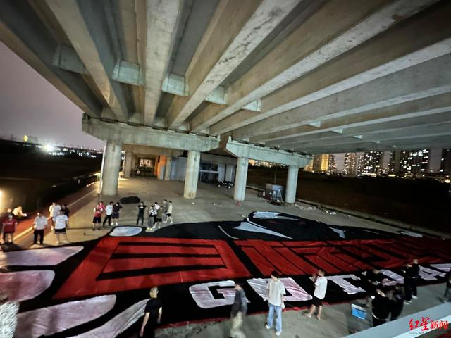 朱宇透露,由于绘制Tifo需要面积较大的空间,所以最初选定的地点是北门一块露天空地,“但当天下起雨来,所有人只能马上转移,最后在前往天府国际机场的高架下面找到一个底层架空空间,才有了一个可以遮雨,又可以展开操作的地方。”而陈涛则介绍说,整个Tifo的布料卷起来重达100多斤,“淋雨之后更是有200多斤重,一般的私家车根本放不下,最后还是叫了辆货拉拉,才完成了转移工作。”