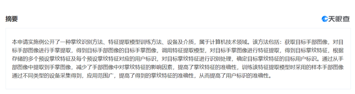 摘要显示,该方法包括:获取目标手部图像,对目标手部图像进行手掌提取,得到目标手掌图像;调用特征提取模型,对目标手掌图像进行特征提取,得到目标掌纹特征;根据存储的多个预设掌纹特征及每个预设掌纹特征对应的用户标识,对目标掌纹特征进行识别处理,确定目标掌纹特征的目标用户标识。