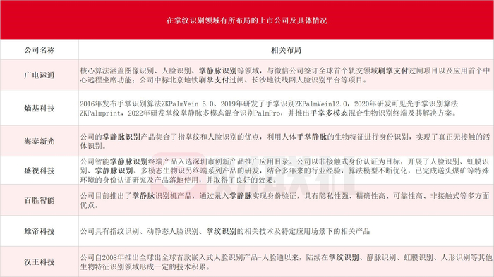 据财联社不完全统计,涉及掌纹识别的A股上市公司包括广电运通、熵基科技、海泰新光、盛视科技、百胜智能、雄帝科技和汉王科技等,具体情况如下: