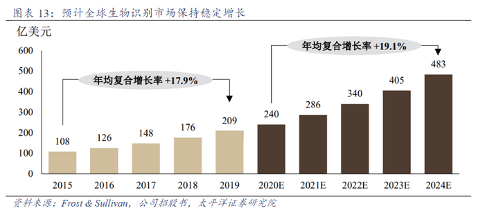 行业整体来看,随着生物识别技术的不断进步、应用场景的拓展,生物识别市场持续扩张,Frost & Sulliva预计全球生物识别市场的规模将以19.1%的年复合增长率从2020年的240亿美元上升至2024年的483亿美元。根据市场调研在线网数据,预计到2025年,中国生物识别技术行业的市场规模将达到1300亿元,同比增长率将达到30%以上。