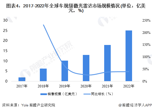 从全球市场来看,根据全球知名咨询机构Yole数据,激光雷达应用是目前全球整个汽车行业增长最快的行业之一。从销售额来看,2021年全球汽车激光雷达销售额约17.90亿美元。前瞻初步统计2022年全球汽车激光雷达市场规模约25亿美元。