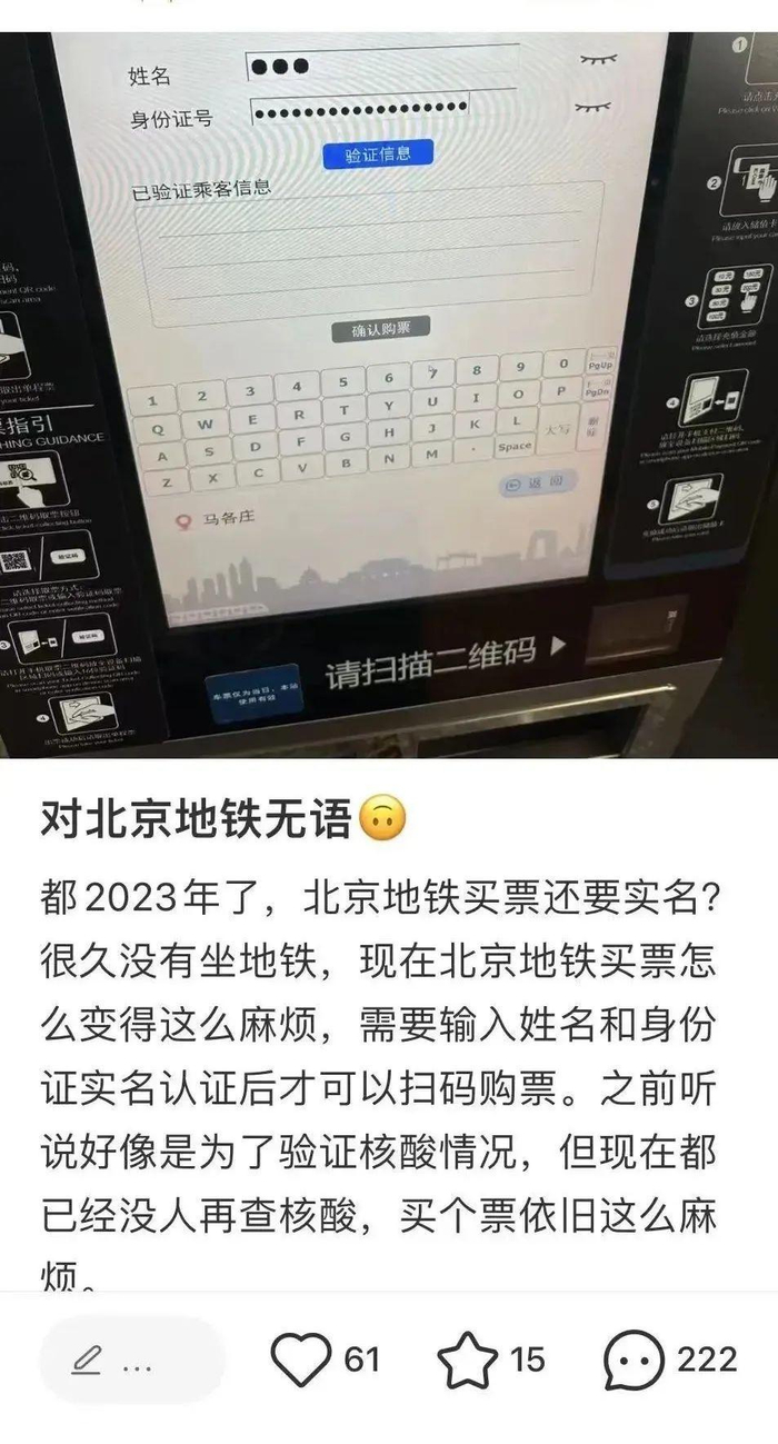 此外王先生还反映,自己五一假期出行时发现,在什刹海、奥森等客流量较大的地铁站,进站购票不需要输入身份证号,而在永泰庄、金安桥等规模较小的地铁站,则需要实名购票。各站执行标准不统一,也让他感到很困惑: