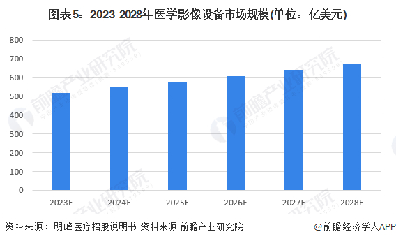 随着医学影像设备技术的进步以及临床诊断对影像设备的需求不断增长,医学影像设备市场将保持稳定发展。据明峰医疗招股说明书数据,预计到2028年全球医学影像设备市场规模将达到607.7亿美元,2023年至2028年复合增长率达5.5%。