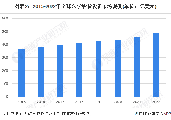 全球医学影像设备市场是全球医疗器械市场的最大组成部分。据明峰医疗招股说明书数据,全球医疗影像设备市场规模由2015年的364.9亿美元增长至2021 年全球医学影像设备市场规模达到458亿美元。预计2022年全球医学影像设备市场规模为487.1亿美元。