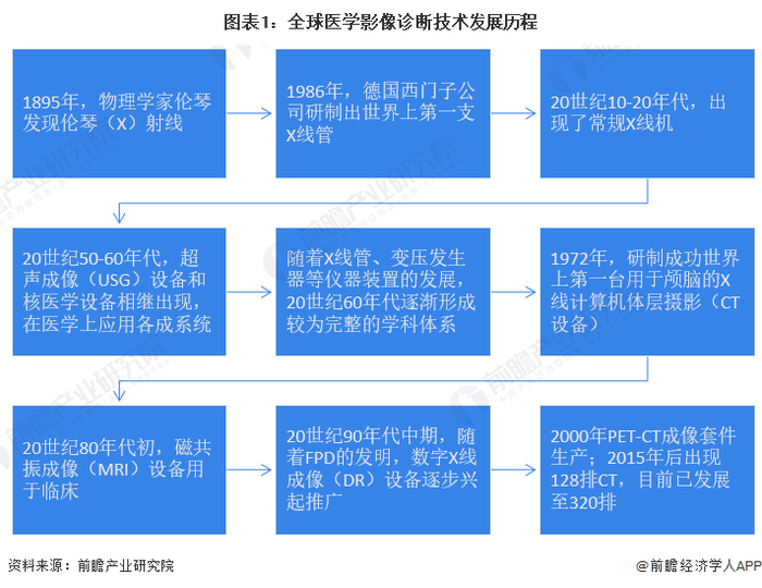 1895年,物理学家伦琴发现伦琴(x)射线。1986年,德国西门子公司研制出世界上第一支×线官。20世纪10-20年代,出现了常规X线机。20世纪50-60年代,走超声成像(USG))设备和核医学设备相继出现,在医学上应用各成系统。随着X线管、变压发生器等相关仪器装置的发展,20世纪60年代逐渐形成较完整的学科体系1972年,研制成功世界上第一台用于颅脑的X线计算机体层摄影(CT设备)。20世纪80年代初磁共振成像(MRI)设备用于临床。