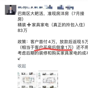 “这套房是回迁房。业主现在不要那么多房了,拿出来低价卖,很划算。从业这么多年也很少见能‘负首付’的房子。”王女士补充道。同为房贷中介的钟先生也声称,自己代理的某楼盘可以做到“负首付”。房产中介赵先生声称,自己已售出一套“负首付”的房产。