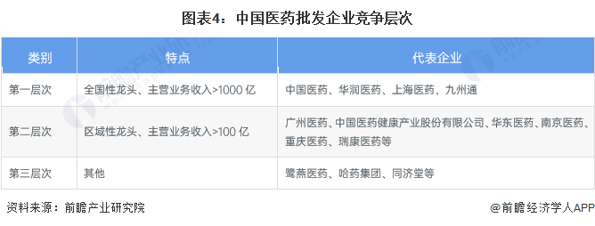 从2021年全国医药批发企业销售100强排名来看,目前中国医药批发行业企业按照销售规模可以划分为三个竞争层次。处于第一层次的是四家全国性批发巨头,中国医药集团、上海医药(集团)股份有限公司、华润医药控股有限公司及九州通医药集团有限公司,其中中国医药集团长期占据第一名,其历年来的批发收入规模均远高于第二名;处于第二层次的是广州医药、南京医药、重庆医药、瑞康医药、安徽华源等,其近三年的主营业务收入均在100亿元以上;其他绝大多数企业则处于第三层次。