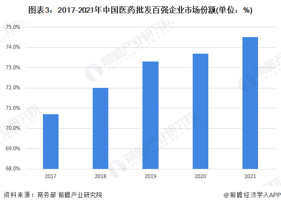 2017-2021年,中国医药批发行业市场集中度整体呈缓慢上升趋势,2021年中国医药批发百强企业市场份额达到了74.5%,与2017年相比上升了3.8个百分点。总体而言,中国医药批发行业市场集中度在持续提高。