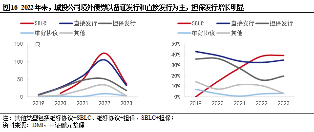根据DMI中资海外债发行数据,地产企业中,备证发行较少,主要是担保发行,其中红筹架构为主。受地产风险影响,2022年地产海外债券新增数量减少,剔除债券重组(交换新票据为主)后,增量进一步减少。城投公司境外债券以备证发行和直接发行为主要方式,2022年来担保发行出现增长,包括“担保发行”(这里主要是母公司跨境担保)和“担保+SBLC”。