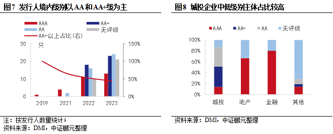 从境内主体信用级别看,约有78%的主体有境内评级,且以AA和AA+级为主。2022年和2023年AA+及以上级别主体数量占比分别为48%和43%。2023年无境内评级主体数量明显增长,相关主体均未在境内发行债券。从境外评级看,2019年来累计24家主体有国际评级,除成都空港城市发展集团有限公司级别为BB+,其余主体级别均在投资级。其中,由中资评级机构评级的有5家,且均在2023年发行。结合行业看,城投企业中AA 及占比最高,达到38%,其他类型主体中无评级较多,包括地方国有投资类、产业类和商业服务类公司。
