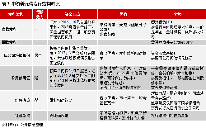 在中资海外债市场中,常见的发行结构分为直接发行和间接发行,间接发行包括备证发行、跨境担保发行(包括境内母公司跨境担保,境内子公司跨境担保)、其他担保发行、维好协议等。随着信用风险和市场制度的完善,发行结构也存在一定的变化,呈现出多元化。