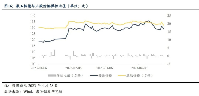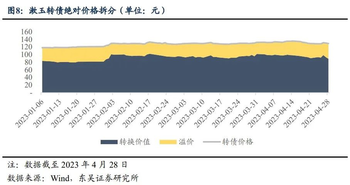 按转换价值和转股溢价率拆分漱玉转债的可转债价格,自上市以来,漱玉转债价格和平价走势基本一致,总体稳中有升。具体而言,截至2023年4月28日,相比上市之初,漱玉转债平价和转换价格分别上行6.58%和8.94%,但溢价较厚,总体在40元左右,或说明市场估值略有偏高。