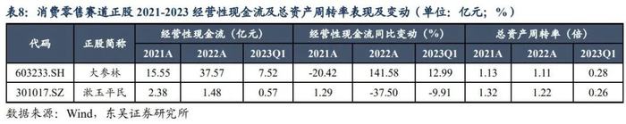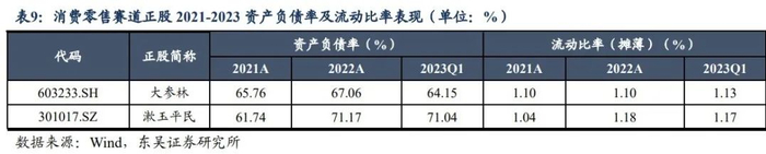 财务风险方面,公司偿债压力较大,2022年经营性现金流为1.48亿元,较去年同期下降37.5%;截止2023年3月31日,公司资产负债率为71.04%,流动比率为1.17,从指标来看,短期偿债能力一般;从债务结构来看,公司以短期负债为主,且2022年短期借款增幅较大,结合同比下降的经营性现金流净流入额,进一步提示公司的短期偿债压力或大于同赛道的大参林,此外公司资产负债率高于大参林,表明公司财务杠杆较高,或需警惕门店快速扩张背后隐含的经营战略风险与现金周转风险。