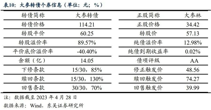 大参转债于2020年11月13日上市交易,正处于“壮年期”,初始发行规模为14.05亿元。基本条款方面,截至2023年4月28日,债项评级为AA级,余额规模为14.05亿元,评级和流通盘均高于漱玉转债,表明大参转债在安全性和流动性方面具有优势。转债价格方面,截至2023年4月28日,大参转债价格为114.21元,相对较低,平价底价溢价率为-40.40%,转股溢价率为89.57%,纯债溢价率为12.98%,纯债到期收益率为0.02%,从以上各项指标来看,大参转债债性凸显,属于偏债型标的。
