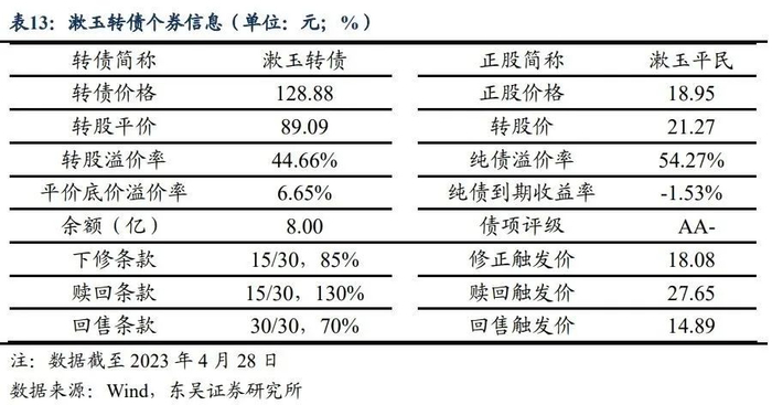 漱玉转债于2023年1月6日上市交易,极为“年轻”,尚未进入转股期。基本条款方面,截至2023年4月28日,债项评级为AA-级,信用风险较高,余额规模为8亿元,叠加大股东持有超过70%,流通盘较小,定价或易受扰动。转债价格方面,截至2023年4月28日,漱玉转债价格为128.88元,平价底价溢价率为6.65%,转股溢价率为44.66%,纯债溢价率为54.27%,纯债到期收益率为-1.53%,综合来看,漱玉转债为平衡偏股型标的,具备一定弹性但债底保护较弱,结合其评级较低、规模较小的特点,安全边际有限。