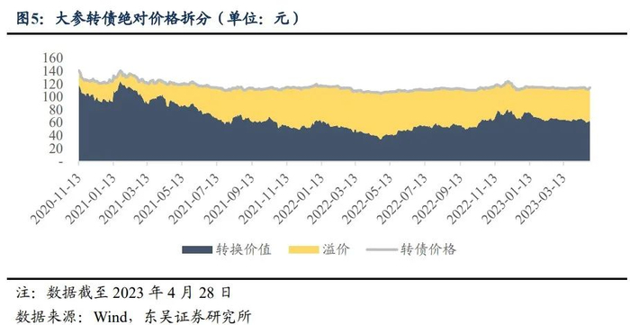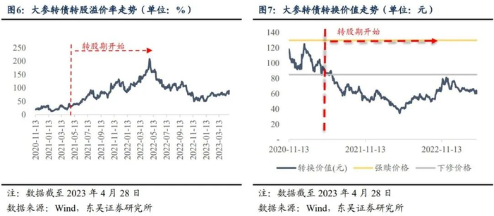 结合转股溢价率走势以及转换价值走势来看,由于大参转债转债价格较为稳定,大参转债转股溢价率与转换价值走势呈显著负相关。具体而言,转股溢价率总体成倒“V”走势,自上市之初转股溢价率便持续上行,至2022年4月下旬达到峰值,超过200%;随后由于正股价格上涨,平价回升,转股溢价率震荡下行;截止2023年4月28日,转股溢价率为89.57%,位于历史的61.9%分位,估值稍有偏高。转换价值总体呈正“V”走势,且长期位于下修线以下,2023年3月27日触发下修条款,公司于2023年3月28日发布不下修公告表明2023年9月27日之前公司均不会执行下修,即尽管大参转债平价符合下修要求,但投资者暂时无法利用下修条款进行博弈,且结合公司2022年及2023年一季度业绩表现持续向好,以及平价处于回升阶段,正股增长动能强劲,或表明公司股东对未来股价信心较强。
