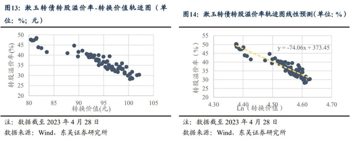 基于此发现,我们对2只标的的转换价值分别进行对数化处理并采用线性预测评估等平价下各标的的转股溢价率表现,进而研判在相等转换价值下各标的的估值高低。结合各标的截至2023年4月28日的数据,我们认为在等平价溢价率测试维度,大参转债表现优于漱玉转债,具体包括以下3个观察结论: