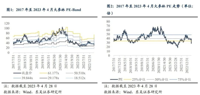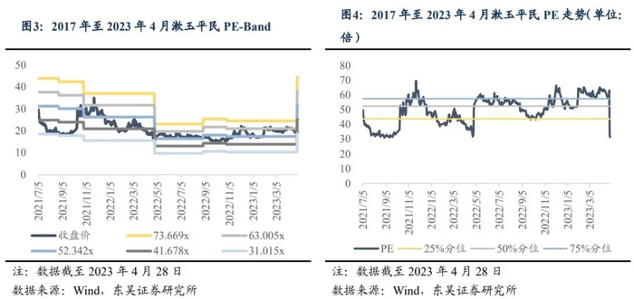 公司自上市以来,PE Band 呈现下降趋势,近期出现上升拐点;PE(TTM)均值、最大值、最小值分别为50.00倍、69.53倍(发生在2021.11.24)、31.01倍(发生在2021.8.31)。由于净利润大幅增加,PE(TTM)迅速由2023年4月26日的63.04倍下滑至2023年4月28日的31.42倍,处于 2014 年以来0.68%的极低分位。