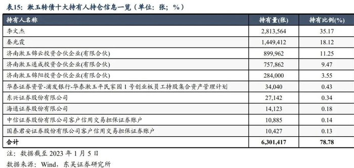 从机构持仓占比情况来看,机构持仓方面,截至2022年12月31日,漱玉转债尚未上市交易,根据基金四季报显示,共7只公募基金产品持有漱玉转债,机构持仓合计占比约0.02%,但由于其信用评级较低,我们预计机构投资者对其关注很可能有限。此外,结合十大持有人持仓信息披露来看,前十大持有人持有比例合计78.78%,主要持有人为公司大股东。