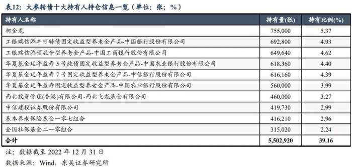 从机构持仓占比情况来看,市场对大参转债热度持续。截至2022年12月31日,根据基金四季报显示,共70只公募基金产品持有大参转债,机构持仓合计占比约13.11%,持仓总市值为1.84亿元;四季度较三季度环比增加持仓22.64万张,市场热度持续,其中前十大机构增持总额较少,合计为1.32万张,长尾效应显著。结合十大持有人持仓信息披露来看,大参转债的十大持有人中总体为稳健收益型养老金和年金产品,符合其偏债型属性,侧面提示大参转债更适宜风险偏好一般的保守投资者。
