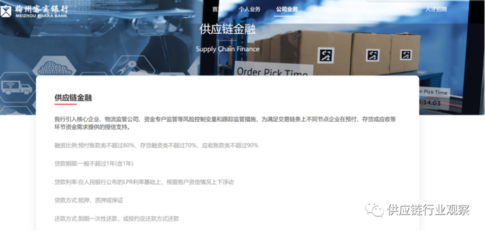 梅州客商银行:引入核心企业、物流监管公司、资金专户监管等风险控制变量和跟踪监管措施,为满足交易链条上不同节点企业在预付、存货或应收等环节资金需求提供的授信支持。