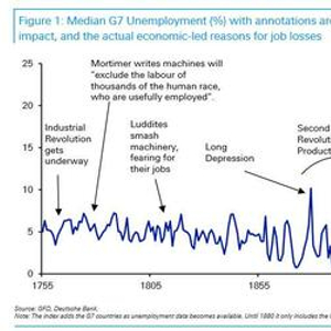 Reid指出,G7国家(7个主要发达经济体)的失业数据表明,失业率主要随经济周期而波动,与技术革命的关联微乎其微。今天,G7国家的失业率中位数为3.8%;作为对比,1755年,第一次工业革命时期,英国失业率为5%。