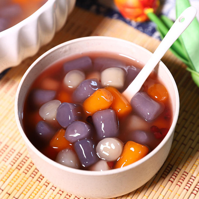 三色芋圆是由红薯圆、紫薯圆、香芋圆混合而成,低脂营养又健康。