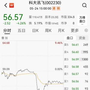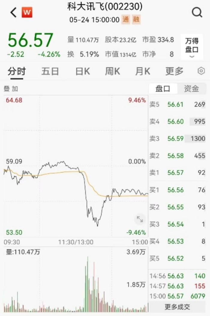 5月24日下午开盘后,科大讯飞股价快速跳水,盘中一度跌超9%。截至收盘,科大讯飞收跌4.26%。