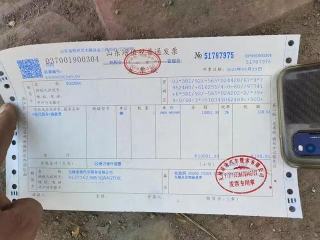 大皖新闻记者看到,张先生夫妻提供的施救费明细表上盖着“无棣道通汽车服务有限公司发票专用章”,施救费用明细为:大型吊车(50T)4000,大型拖车1800,大型倒货车2台3200,人工费8人2000,合计11000元整,落款为2023年5月23日。另外一张“无棣道通汽车服务有限公司”的发票显示“*现代服务*施救费”为壹万壹仟圆整。