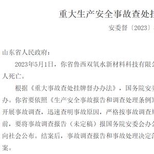 《通知书》显示,2023年5月1日,山东省鲁西双氧水新材料科技有限公司(以下简称“双氧水公司”)发生一起重大爆炸着火事故,造成10人死亡。根据《重大事故查处挂牌督办办法》,国务院安委会决定对该起重大事故查处实行挂牌督办。