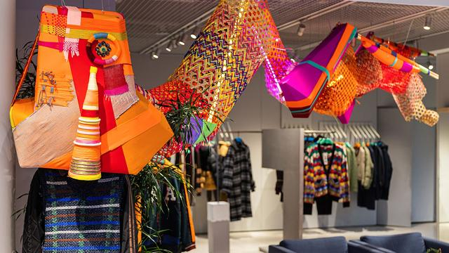 时间来到2022年的春节,以传统编织工艺创作的艺术装置“蝈蝈虎”走出青山村,走进城市商场的江南布衣+集合店。记者了解到,6位青山村手工艺人在中国传统的竹制六角编基础上,穿插毛毡、毛线、绑带、喷漆等手工技艺制作,并利用江南布衣的往季库存布料,在保留传统编织作品自然之美的同时为艺术装置注入新的生命。而这,是江南布衣与融设计图书馆“交融”的起点。