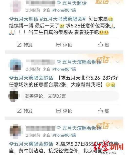 早在五月天北京演唱会第一次开售时,其歌迷就在网络开展抵制,称“宁可鸟巢门口站,也不能让黄牛赚”。随着五月天开唱在即,网上“求票”的人多了起来。社交媒体上的留言也渐渐变成:礼貌求855元以内价位连座,接受轻微溢价。