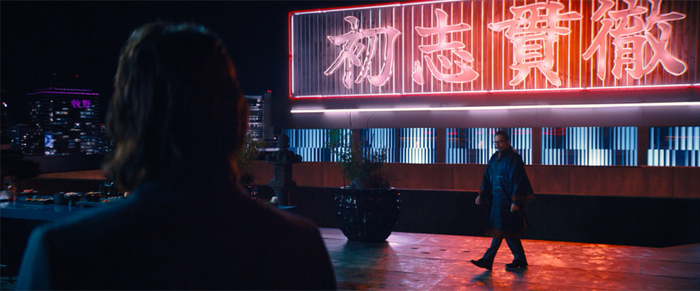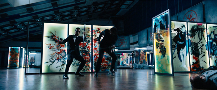 从上一部开始,导演突然在朴实的动作设计之外,学会了在场景中布置大量广告式的炫彩灯光,用以营造次时代的游戏风格。同时借助镜子、玻璃等道具的大量碎裂,也能增强动作的力度感。本片前一半故事发生在日本大阪,场景中有不少霓虹灯管和摆放道具,整体色彩变得更加张扬突出,体现着神秘的东方风情。同时也利用日本刀剑等作为主要武器,做了不少精彩的打斗设计。都给了观众炫目的新鲜感。