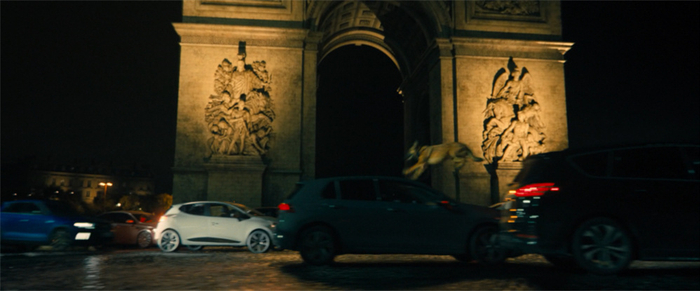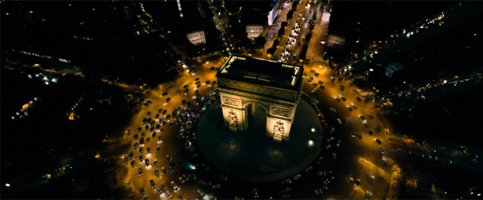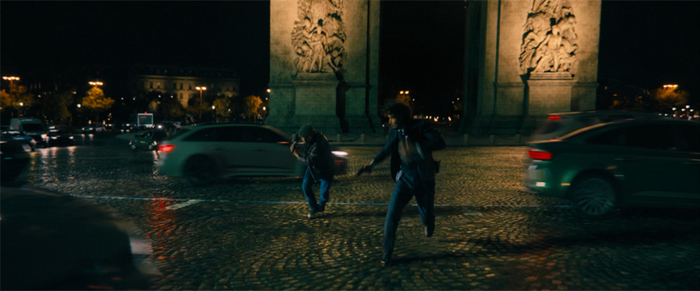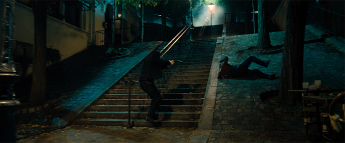 后一半故事发展来到热闹市井的巴黎。在众多杀手追杀主角的高潮戏中,众人在凯旋门之下的环形大广场,汹涌穿梭的车流之中展开打斗。有高速车辆的躲避和撞击,有枪战和近战的来回交替,甚至还有一条狗闪耀地跳跃出场。即使明知其中大部分是特效合成的场景,但复杂的环境设计和人物动作的精确,仍然让这一场成了影片中最华丽的场面,甚至放在近十年的动作片来看,效果都是顶尖的。