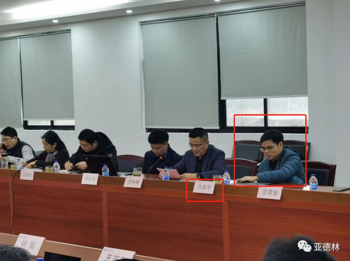 在当天的会议中数十名亚德林股东端坐会议桌两旁,亚德林董事长沈林根称因疫情等因素导致公司未能如期上市感到抱歉。记者获得的现场照片桌牌显示,坐在沈林根左右两边分别是方友平与劳宇明。根据亚德林的招股书显示劳宇明是该公司的董事、董秘属于核心高管,而坐在沈林根左手边的方友平则显神秘,记者未能在亚德林目前公布的股东名单和高管名单中找到此人。