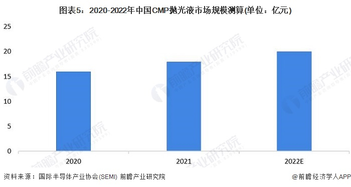 综合来看,在半导体制造过程中,各类细分材料比重相对稳定,若以上述材料结构进行测算,2021年,我国CMP抛光液市场规模约为18亿元,2022年,我国CMP抛光液市场规模约为20亿元。