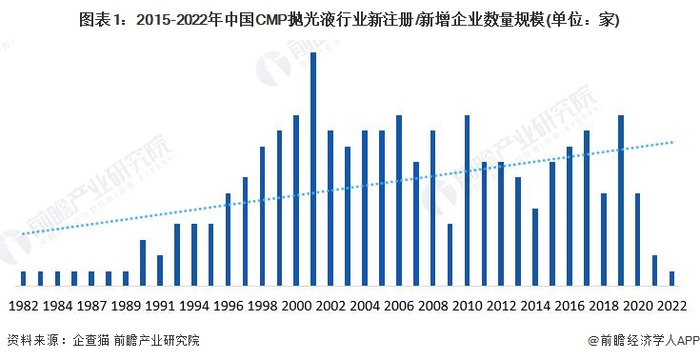 根据企查猫数据显示,我国CMP抛光液行业参与企业数量较少,相关企业数量范围在250家左右。从变化趋势来看,1981年以来,中国CMP抛光液新增企业数量整体呈波动上升的变化趋势。