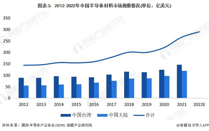 根据SEMI统计数据,2012-2021年期间我国半导体材料市场规模总体呈波动增长态势。2021年我国台湾地区半导体材料市场规模达147.1亿美元,大陆地区半导体材料市场规模达119.3亿美元。SEMI预测,2022年全球半导体材料市场整体规模预计将增长8.6%,达到698亿美元。结合中国半导体材料在全球的规模占比情况,初步估算,2022年,我国半导体材料市场规模在全球占比将超过41%,市场规模或将超过290亿美元。